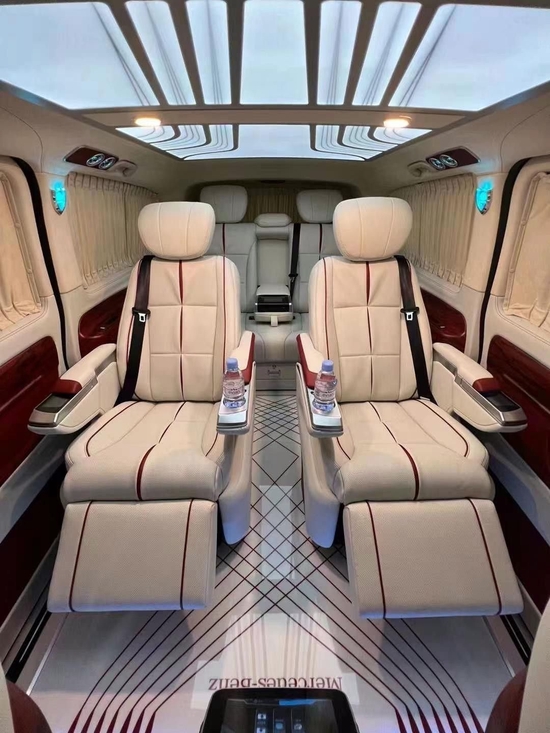 奔驰V250鲨鱼T版改装TopCar包围,一键式32寸高清液晶升降电视,搭配影院级音响系统,仿佛如行走的IMAX影院级视听体验。而前后舱隔断航空铝材,不仅保证前后舱的独立私密性,更专注后舱视听效果的享受。液晶屏可升降,可以面对面的交流,也可以通过前后舱联络电话以及智能语音聊天系统。