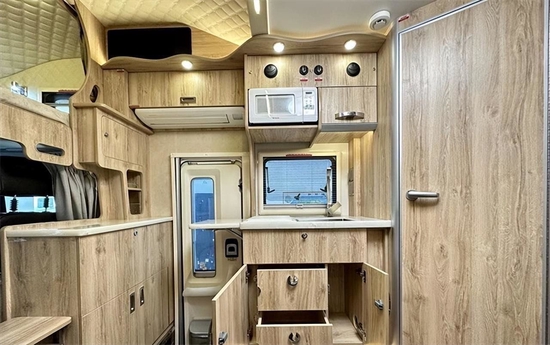 车内采用三菱的1.5P直流变频静音节能空调和伟巴斯特的进口驻车燃油暖风,还配备卡洛西进口行车冷风,为长途旅行奠定基础。会客区采用经典的四人对坐卡座样式,超大外推窗,增加了自然光照入车内的面积,座椅的上方有丰富的储物空间。升降桌降下与对坐沙发可以拼成一张1900*945(mm)的临时床位。