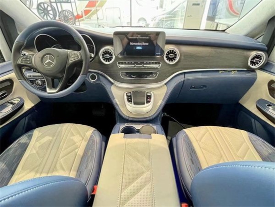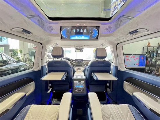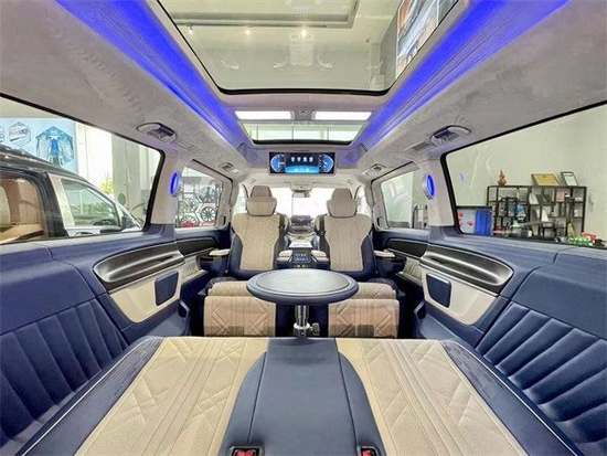 后舱二排座椅进行旋转,可以与第三排沙发座椅形成一个对卡座布局,瞬间形成移动办公室为我们切换到商务谈判模式。第三排座椅支持180平成床,为我们提供舒适的休息空间。本款奔驰V260L商务车的顶灯部分运用的是迈巴赫圆弧形顶灯设计,材质采用美国进口石英水晶,通过镶嵌式总控进行控制,三色可变,营造出舒适氛围。