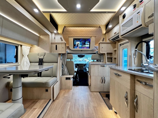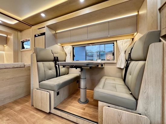 车内部分采用中式的家居风格,更符合中国人的审美,会客区采用双人对坐卡座设计,可以向外侧拓展开来,将餐桌向下可与卡座拼接变为一张1900*945(mm)的沙发床。上方设计有一组吊柜,可以放置一些物品,配合我们尾部储物仓让我们整车的储物空间达到惊人的2500L;左侧拓展出去以后中间有了一块非常宽敞的空间。内饰采用了棕色木纹加米色木纹的装饰,沉稳内敛十分讨喜。
