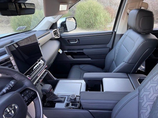 23款丰田红杉车内采用了大量软质材料包裹,部分区域还加入了缝线处理,显得档次感和质感十足。任经理13836729331 (电话同微信)另外车内采用的是四辐式多功能方向盘,并保留了很多物理按键,足以满足驾驶时想要的操控感,车内的科技氛围是通过12.3英寸的全液晶仪表盘和14英寸的中控屏来实现的,中控屏两侧的空调出风口,虽然没有采用时下流行的贯通式设计,但在中控台上对称排列也别有一番风味。另外顶配Capstone车型的内饰将会采用更加豪华的黑白配色