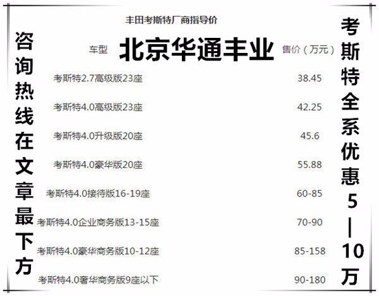 北京华通丰业4s店丰田考斯特直营店专业从事商务车出售,装饰事务多年,承接过中心上级领导观察用车及北京、天津、上海、山东、河北、山西、内蒙,东北等各地政府用车和奢华商务改装车,技能专业,做工精深,售后周到完善,深受广大顾客朋友好评。主要对丰田考斯特丰田埃尔法版车型的改装,现在已能依据顾客要求改装各种车型。