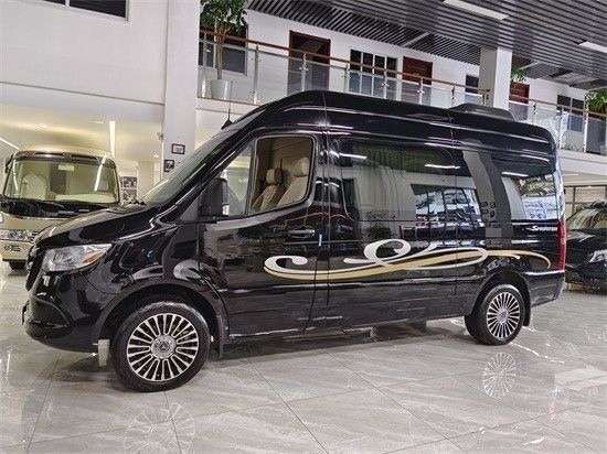 既可以定制,也可以有现房、样本房,哦不对,是现车和样车。文中图片是个性化定制好的实车,布局风格采用的是经典的7+2布局方式。整车核载7人,驾驶舱与后面的商务舱通过隔断隔开,给后面的商务舱提供了私密空间。但又没完全隔开,因为宽屏曲面网络电视是可以升降的,降下来之后,前后舱可以直接沟通。一体式的吧台隐藏着两个翻折式座椅,可供航空椅上的老板放脚用,也可以临时开会对坐用。对坐当然少不了收缩式的小圆桌。