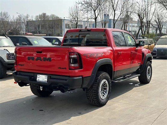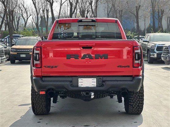全新23款道奇公羊霸王龙TRX国六最新款新车传承了道奇Ram家族高大威猛的造型设计,同时细节部分融入了更多高性能元素,包括经过黑化处理的前格栅,引擎盖两侧的黑色进气口,霸王龙 以及为了容纳巨大的机械增压器而设计的通风口等等。此外,新车还配备了视觉冲击力更强的黑色轮眉和外露式的拖车钩,看上去十分霸气。