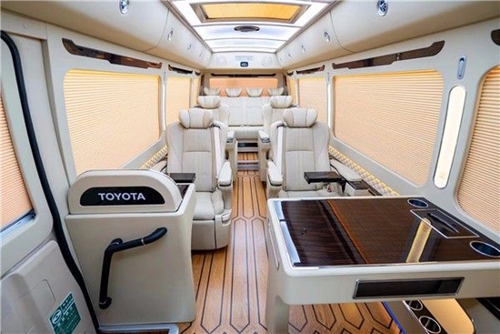 丰田考斯特12座的内饰设计是为了突出接待规格,使车内更加美观、更加舒适或者更能彰显一种尊贵的身份。丰田考斯特在内饰的改装上更加注重氛围的衬托,高档的豪华座椅,自动调节的百叶窗帘,车载影5.1声道音系统。丰田考斯特改装的独特之处。配备上高档的办公桌,在注重实用性的同时也可以满足我们办公或者旅途中吃饭的需要。华通丰业贴心的设计是丰田考斯特中巴车能够被更多的人所珍惜的重要原因。