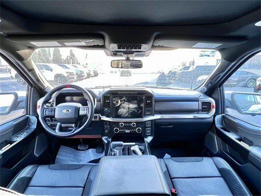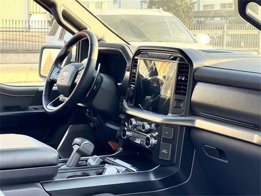 新款福特猛禽内饰采用独特的中控台和门饰板面漆和真皮包裹的方向盘。中控台部分辅以银色饰板装饰,六指针仪表盘的设计有些后工业时代的复古风格。采用带电冷热功能的可记忆式皮革座椅,头枕四向可调,搭配铝饰条和黑色钢琴烤漆内饰可电动升降的后窗带隔板和电热除霜功能。