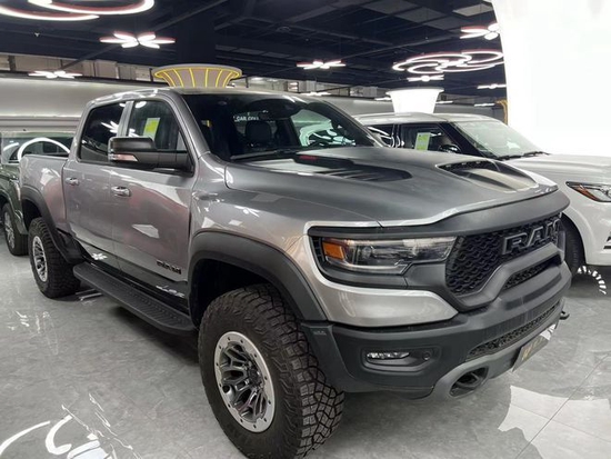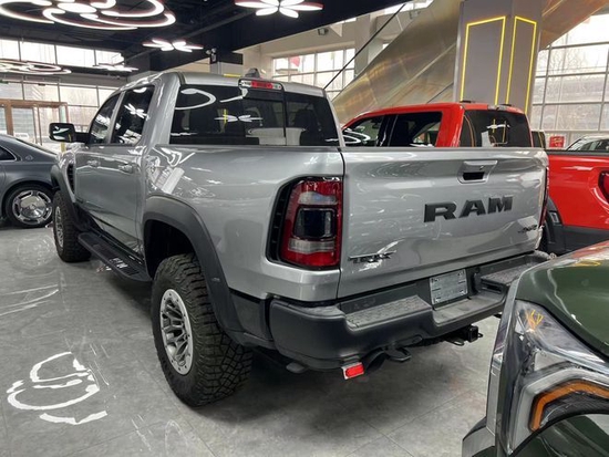 23款道奇公羊霸王龙TRX国六最新款新车传承了道奇Ram家族高大威猛的造型设计,同时细节部分融入了更多高性能元素,包括经过黑化处理的前格栅,引擎盖两侧的黑色进气口,霸王龙 以及为了容纳巨大的机械增压器而设计的通风口等等。此外,新车还配备了视觉冲击力更强的黑色轮眉和外露式的拖车钩,看上去十分霸气。