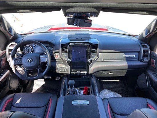 22款道奇公羊霸王龙TRX在内饰部分进一步强化了其高性能版本的形象,中控台和座椅随处可见的TRX标识便是最好的例证。同时,作为道奇家族的旗舰车型,新车还配备了12英寸竖置中控屏幕,除了支持蓝牙、导航和车载Wi-Fi等常见功能,还支持Apple CarPlay和Android Auto手机映射。