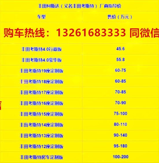 全国销售-考斯特厂商指导价(万元 )丰田考斯特4.0高级版42.25万丰田考斯特4.0行政版45.6万丰田考斯特4.0升级版47.8万丰田考斯特4.0豪华版56.08万丰田考斯特19座定制版60-75丰田考斯特18座定制版60-85丰田考斯特17座定制版50-80万丰田考斯特16座定制版60-90万丰田考斯特12座定制版78-158万丰田考斯特10座定制版88-128万。