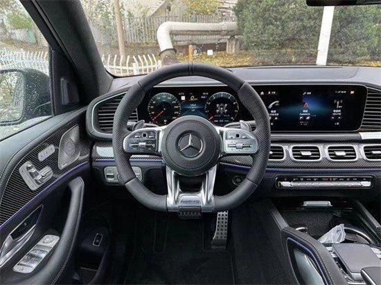 全新奔驰GLS63家族化的三幅式方向盘方向盘,方向盘的两侧采用了打孔装饰,看上去很有性能感并且很豪华。新车的内饰装饰了大量的氛围灯,前侧的扶手上也配备了氛围灯。