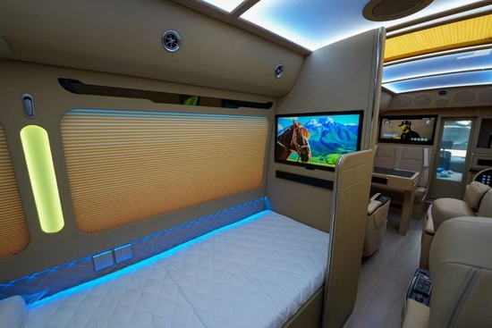 丰田考斯特作为一款顶级商务旅行房车,内饰的豪华改装绝对是主打卖点,仅仅从外面透过一点点缝隙看车厢的内部都能感觉到里面的奢华感,华通丰业车顶有七色炫彩的空客顶灯,绿色灯光的宁静,或者是粉色灯光的温馨,华通丰业各种颜色可使用遥控器随心调节,以及窗帘内部的七彩调节LED灯(通过触摸屏自由调节开启)舒缓眼睛疲劳,给您心灵上的抚慰,华通丰业七彩窗帘立柱灯提升整体品味又或是全车的游艇木柚木地板(防潮防滑耐脏),侧壁上的阅读灯营造温馨舒适环境,处处都在体现改装后的高品质、高咖位。