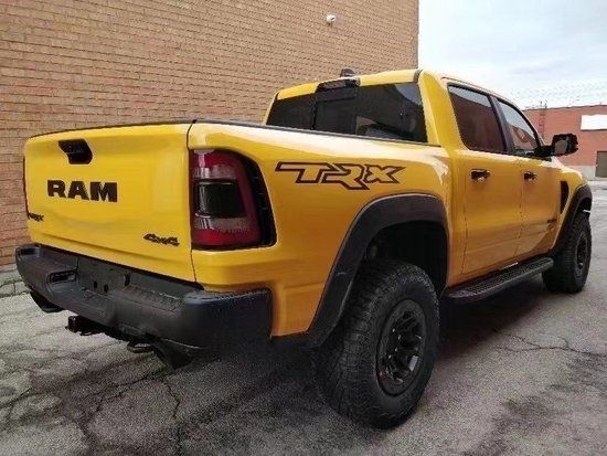 23款道奇公羊霸王龙TRX国六最新款新车传承了道奇Ram家族高大威猛的造型设计,同时细节部分融入了更多高性能元素,括经过黑化处理的前格栅,引擎盖两侧的黑色进气口,霸王龙 以及为了容纳巨大的机械增压器而设计的通风口等等。