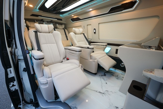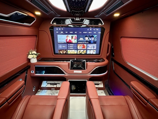 这台海狮整车升级了加强型的隔音隔热处理,东方众威原创车内带空气净化系统,无线充电系统。在进门侧加装了氧化铝脚踏带迎宾灯的,整车都是采用纳帕级皮质进行包覆的,侧壁红木装饰,手动百褶窗帘,后舱暖风系统,最后说说棚顶灯光,这个有智能触摸控制系统。灯光超级棒。