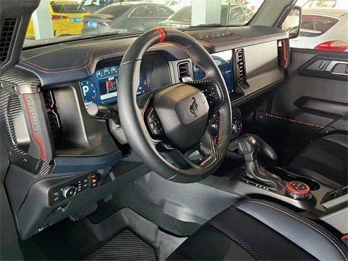 23款福特烈马Bronco 3.0T四门Raptor猛禽车内采用硬朗的设计风格,中控台设计主次分明且有层次感用料也厚实。多功能方向盘造型运动,中控屏幕采用内嵌式的设计增添了车内的时尚感,按键布局合理档把设计精致座椅宽大厚实空间宽敞实用性强。