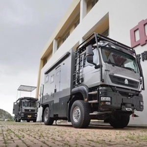 重汽豪沃无疆飞桥升顶式4X4越野房车配备有方舱专用全铝遥控乘客门、手动纱门、越野房车专用双层铸铝外推窗、3.5米进口自动电动风感遮阳篷,电动液压上车踏步、驾驶室顶置行李箱、泓晟达 3000W发电机、电动摩托车架、外挂行李箱、外抽拉烹饪灶台、12000磅前绞盘+20000磅后绞盘、外接市电系统、车外淋浴器、清水箱注水口+水泵取水注水口、污水排放口、黑水箱存放口、中位金属保险杠、飞桥升顶露台、四方位影像+车内4路监控系统摄像头等全套户外生存设备。电动摩托车架、外挂行李箱、外抽拉烹饪灶台、均为车尾一体的电控升降设计,离地非常高,即使涉水,也对设备没有危害。