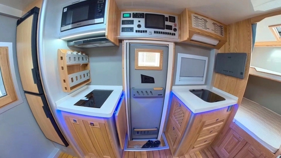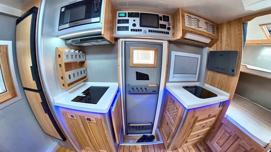 会客区右侧,设有车内厨房区域,以房车中门隔开,分离式设计,使烹饪空间得到极大的提升,搭配厨房各项烹饪设备,即使在荒野戈壁也能随时吃到火锅等美食,不用再吃速冻或者其它简易食品。分离式设计的厨房,左侧安装有一台西门子电磁炉、一台156L赛特福德房车专用冰箱、一台房车专用抽油烟机、调料架及多种储物柜与厨具专用存储柜等。