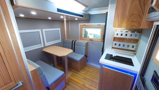 在会客区上方,安装有吸顶式储物柜加一台内嵌式行/驻车两用的格力变频空调,沙发座椅后方固定有32寸飞利浦液晶电视+日本YAMAHA八喇叭音响系统,内侧墙壁配备两扇通风观景窗,在底部则安装有特鲁玛 COMBI 燃油暖风热水一体机取暖出风口和220V电源插座等设备。值得注意的是,会客区与驾驶舱中间并没有采用封闭式设计,设有一张可开启式互动窗,以便前后观察和交流使用。
