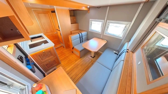 进入乘客门左手边是厨房所在区域,料理台台面集成带盖一体式水槽+水龙头及西门子微波炉;周围收纳空间便于存放厨余用品;其它配置有驾驶室30L英得尔车载冰箱、抽油烟机、大宇3KG洗衣机(带烘干)、伟巴斯特暖风加热器(净水箱、灰水箱、黑水箱防冻专用)、160L嵌入式多美达分体式冰箱(单个80L)、四路监控、一氧化碳、烟雾报警器等。