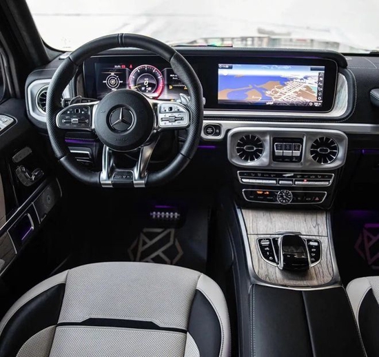 2022款全新G63内饰方面,新G63保留了新G500的整体设计,除配色差异外,新车还换装了全新造型的平底式AMG运动方向盘,其两侧配以打孔皮质包裹,下部镀铬装饰的造型也与新G500明显不同,看上去十分战斗。此外,全液晶仪表盘+中控大屏的双12.3英寸屏幕设计在新车上也没有缺席,营造出了浓郁的科技感。