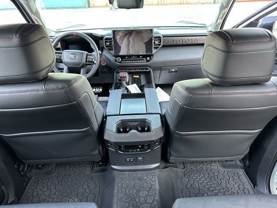 2023款丰田红杉混动新车基于TNGA-F平台打造,在设计风格上有很高的相似度。其中一款车型的前脸看起来和坦途基本一样,特别是大尺寸的横向进气格栅以及两侧的L形大灯组,不过格栅和下包围并未像坦途那样是相连的,但却显得车头更加霸气,而且还增加了些层次感。全新红杉还提供了另外两种前脸样式可选,包括蜂窝网状设计以及熏黑波浪形并搭配了“TOYOTA”标识的进气格栅造型。另外,车头上的雾灯组都设计在下方护板上,点亮后有很高的辩识度。
