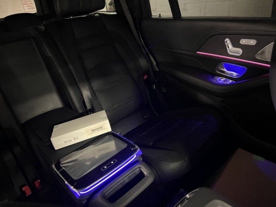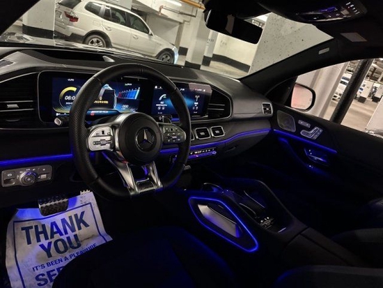 23款平行进口奔驰GLS63AMG家族化的三幅式方向盘方向盘,方向盘的两侧采用了打孔装饰,看上去很有性能感并且很豪华。任经理13836729331 (电话同微信)新车的内饰装饰了大量的氛围灯,前侧的扶手上也配备了氛围灯。