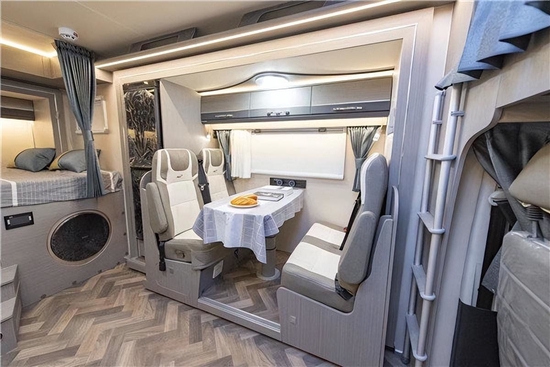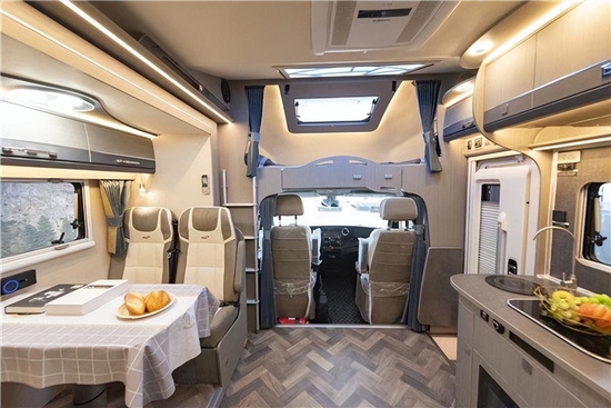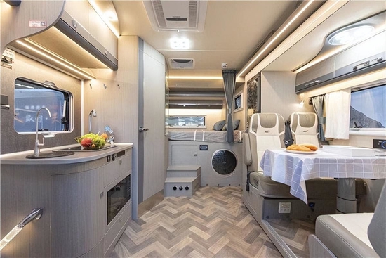 内饰方面,采用进口E0级环保标准的房车家具板材,铺设比利时原装进口环保房车专用地板革,带来环保健康的旅居生活空间。米色墙面与原木色板材,搭配暖色调灯光,带来温馨舒适的视觉体验。生活区布局从前至后依次为额头床、会客区、厨房、卫生间、尾部休息区。采冷供暖方面,生活区安装有进口驻车变频顶置空调、进口埃贝赫驻车燃油暖风热水一体机,带有高原模式,无论何时出行,车内均能保持舒适温度。