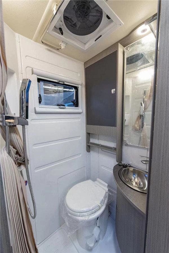 卫生间内部采用了淡雅豪华的设计风格,结合了石材和木材,宛如豪华酒店一般,内部配备了多功能豪华卫浴系统、洗手台盆、进口直排式坐便器以及顶置排风扇、化妆镜等配置,搭配300L净水箱+ 50L灰水箱+50升黑水箱的配置,无需担心用水问题。