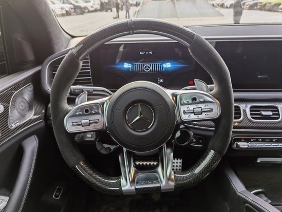 22款奔驰GLS63特有的三幅式运动方向盘肯定是不能少,采用了平底设计,金属饰板加上周身真皮打孔的设计,握感非常不错,底部的AMG字样让你很有驾驶欲望。