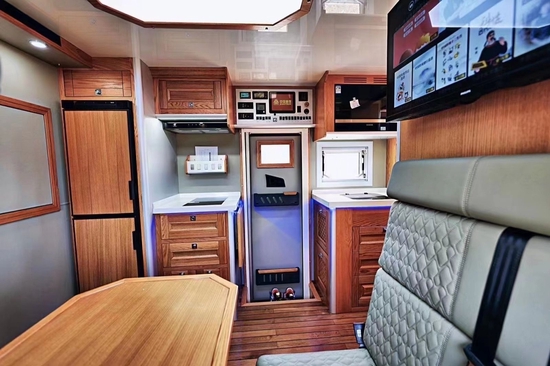 车内实木(美国红橡)搭配拉丝铝板家具+环保型房车专用柚木地板革;布局方面,采用了会客区对卡座沙发+气动升降餐桌+实木组合式橱柜+卫生间+车尾横置上下床的布局结构设计,全车的储物空间非常丰富,对于长期户外旅游者来说实用性高。暖色系氛围更贴近居家效果,让成员即使在外旅行也能感受到住家的感觉。会客区真皮软包对卡座沙发满足4人乘坐,卡座沙发搭配气动升降餐桌可变为一张沙发床;固定式安全带保护行车途中乘客的人身安全。坐垫厚实,弧形靠背也提供一定的支持感,整体来说乘坐舒适感还是不错的;沙发内侧墙壁2个独立外推窗,提供采光及通风换气效果;三菱重工变频空调(单冷)制冷效果快,可手动调节温度;吊柜方便日常收纳物品。