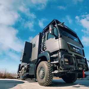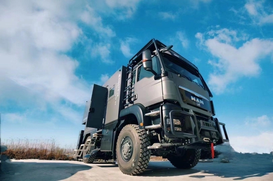 新重汽曼恩4×4重型越野房车基于重汽豪沃TX 4×4底盘打造,车身尺寸为5995×2550×3690(mm),轴距3600mm,整备质量12200kg,最大总质量13000kg,油箱容积为400L,可轻松续航1800公里;车身采用德国曼TGA柔性车架,箱体为热断桥硬化铝骨架六层加强保温结构,厚度为60mm,耐零下30度低温。越野专用方舱造型,三点悬浮设计,保证车厢稳定性的同时也防止意外变形,地板及家具异响,极大延长箱体使用寿命。底盘方面,前后悬挂采用前后专用板簧+液压筒式减震器的组合形式,其作用可过滤行驶途中的颠簸感也保证了舒适性;三把差速锁也让它对于任何路况都可从容不迫的通过,提升了户外越野的生存性。轮胎规格为425/65 R22.5。