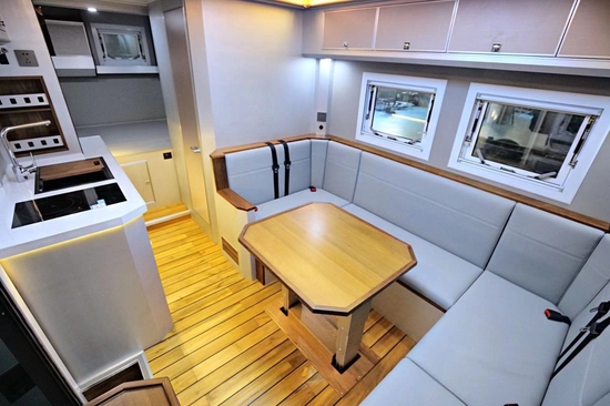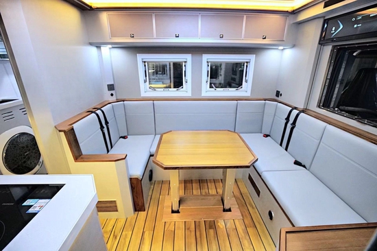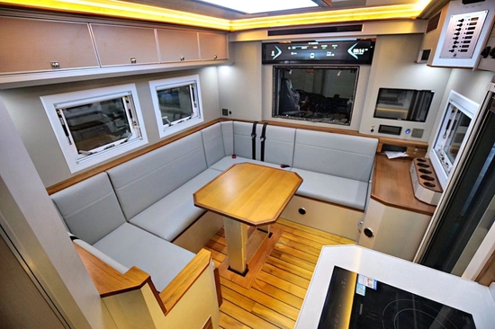 局方面,采用了会客区U型卡座+双电动支腿升降餐桌+厨房区+卫生间+横置拓展床的布局,冷色系氛围等+暖色光源营造出美轮美奂的效果,让成员即使在外旅行也能感受到住家的感觉。前部通舱口位置设计为32寸飞利浦液晶电视,配合室内日本YAMAHA八喇叭音响系统(带低音炮),即便走到哪里都是一个移动的私人家庭影院,邀请亲朋好友一起观看相信能带来愉快的视听体验感。同时,2023款作为最新款式,推出多种布局形式及内饰搭配,风格商务、奢华,具体以实际定制时为准。