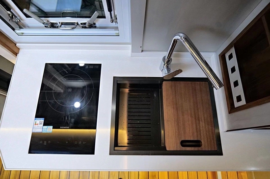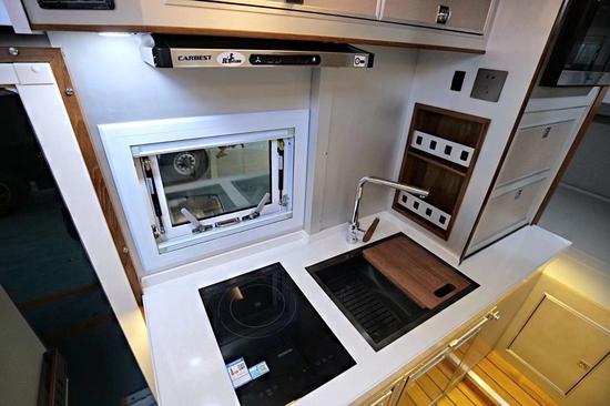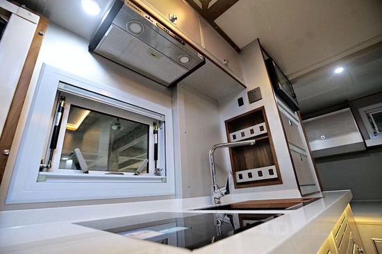 进入乘客门左手边是厨房所在区域,料理台台面集成带盖一体式水槽+水龙头及西门子微波炉;周围收纳空间便于存放厨余用品;其它配置有驾驶室30L英得尔车载冰箱、抽油烟机、大宇3KG洗衣机(带烘干)、伟巴斯特暖风加热器(净水箱、灰水箱、黑水箱防冻专用)、160L嵌入式多美达分体式冰箱(单个80L)、四路监控、一氧化碳、烟雾报警器等。