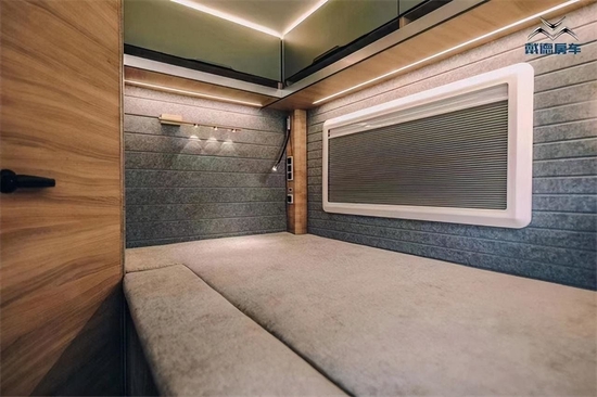 休息区采用纵置床设计,床铺尺寸为2000×1200mm,可以容纳双人休憩。床里侧采用软包处理,灰色绒布墙面设计会显得休息区更有质感。床铺侧面配有车窗、床头阅读灯、充电口等,方便车主娱乐或阅读使用。顶部配有储物吊柜,可以收纳日用物品。