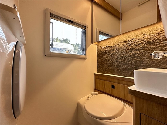 卫生间是一个非常有意思的地方,配备陶瓷洗手盆、抽拉马桶、滚筒洗衣机、储物柜、梳妆镜等设施。梳妆镜下方洗手台上的墙体做了岩板质感的山体设计,自然感更亲近,有着五星级酒店的卫生间质感。