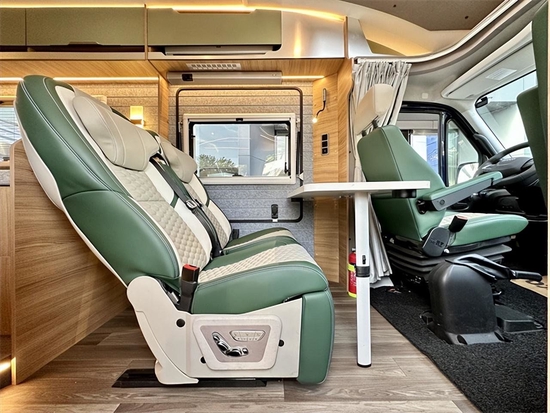 商务化客厅区域,此车的核载人数是4人,主要就是应用于三两好友,或者一家日常短途的放松娱乐。会客区提供两张保姆车级别航空座椅和可拆卸餐桌,座椅支持电动调节、加热、通风、按摩并且提供腿部支撑,舒适性无需多言。配置上,餐桌上方设有多组220V/USB充电接口,基于大功率逆变输出,车内支持多电器同时用电。升降桌板可根据用车环境来决定怎么使用。