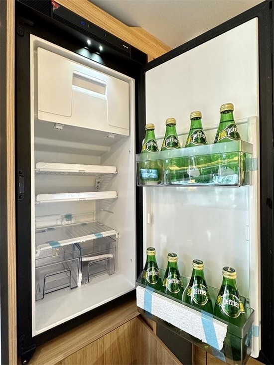 厨房区,厨房台面内嵌不锈钢洗手池+软管龙头,侧面装有可翻折拓展式桌板,打开后可增加操作使用面积;在台面的下方配有橱柜,可放置一些日常的厨房用具;厨房区后方是90L赛特福德冰箱,可存放酒水饮料,保鲜蔬菜水果等物品。