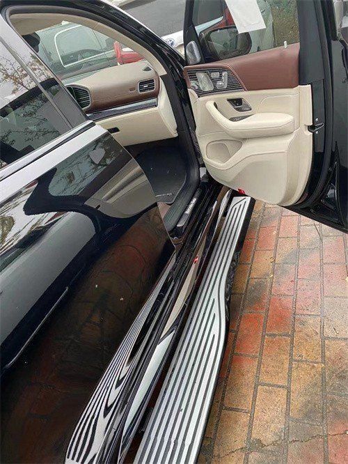 对于奔驰GLS这样的SUV来说,如果家里有老人孩子的话原车的固定踏板会非常不方便,所以还是有必要更换电动踏板的,而且原车都留有安装位置无需后期打孔,打开车门,伸缩出来的是一个迈巴赫1:1的电动踏板,钢琴烤漆的材质,后排的宽度是非常宽的,因为迈巴赫这台车的尊贵是给到后排的。