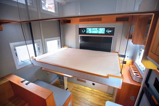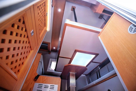 肯定很多小伙伴非常关心整车核载几人,非贯通核载3人,贯通核载6人,旅居车公告,也就是说可与小客车同享节假日免费通行政策,满足国六排放。生活区加装了内部通话系统,便于交流;全部采用美国进口红橡实木家具搭配拉丝铝板材质,外加环保型游艇专用柚木地板,并辅以保温隔音软装和各种灯源烘托,不仅提升了整体空间质感,同时也符合用户对起居空间的标准。顶部吊柜和一台力直流变24V频空调不仅满足行、驻车双用,开启后可以输送风到车内各个角度;取暖方面,单独配备一部伟巴斯特燃油暖风热水一体机供用户使用。