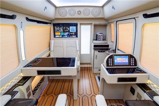 丰田考斯特12座的内饰设计是为了突出接待规格,使车内更加美观、更加舒适或者更能彰显一种尊贵的身份。丰田考斯特在内饰的改装上更加注重氛围的衬托,高档的豪华座椅,自动调节的百叶窗帘,车载影5.1声道音系统。丰田考斯特改装的独特之处。配备上高档的办公桌,在注重实用性的同时也可以满足我们办公或者旅途中吃饭的需要。华通丰业贴心的设计是丰田考斯特中巴车能够被更多的人所珍惜的重要原因。