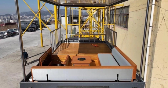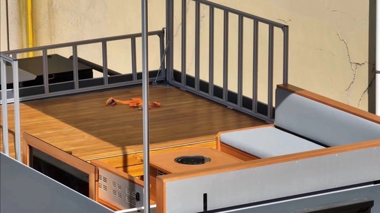 会客区与驾驶舱之间设有通舱口,方便乘客观察前方道路的同时,也便于搭载更多乘客,整车最多可核载6人;通舱口下方设有隐藏电动升降式电视,搭配生活区立体声音响系统、前后对讲系统,轻松满足行驻车途中影音娱乐的需求,双人升降吊床。