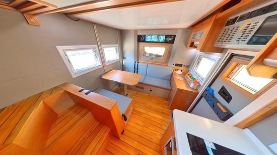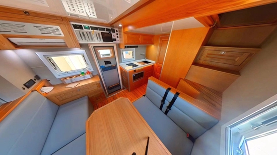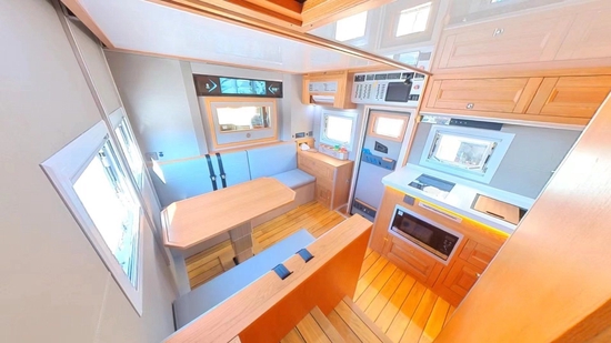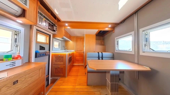 肯定很多小伙伴非常关心整车核载几人,非贯通核载3人,贯通核载6人,旅居车公告,也就是说可与小客车同享节假日免费通行政策,满足国六排放。生活区加装了内部通话系统,便于交流;全部采用美国进口红橡实木家具搭配拉丝铝板材质,外加环保型游艇专用柚木地板,并辅以保温隔音软装和各种灯源烘托,不仅提升了整体空间质感,同时也符合用户对起居空间的标准。顶部吊柜和一台力直流变24V频空调不仅满足行、驻车双用,开启后可以输送风到车内各个角度;取暖方面,单独配备一部伟巴斯特燃油暖风热水一体机供用户使用。