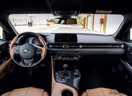 车辆尾部,其尾箱盖大幅度的上翘起到尾翼的效果,其尾灯组部分和后包围上的出风口相连接,同时尾部的 SUPRA 车标也变为红色,凸显出手动挡和自动挡车型的不同。此外,后包围下方的黑色区域带有扩散器的造型,配合双边共两出的排气布局,战斗感十足。尺寸方面,新车长宽高分别为 4381mm/1867mm/1310mm,轴距为 2470mm。