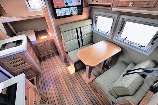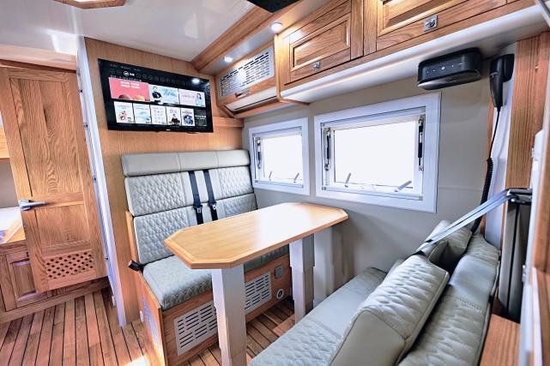 车内左侧会客区,沙发对卡座设计,座椅全部采用进口超纤材质包覆,加以提升乘坐的舒适性,中间升降餐桌采用橡木制成,能与沙发联动形成一张尺寸为1900*1000mm的沙发床。
