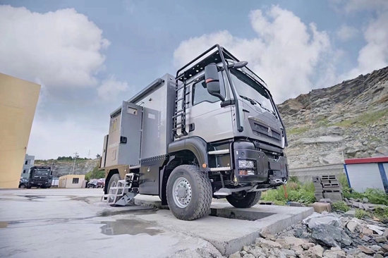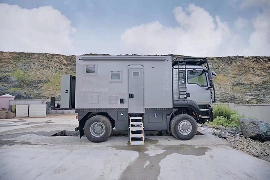 新重汽曼恩4×4重型越野房车基于重汽豪沃TX 4×4底盘打造,车身尺寸为5995×2550×3690(mm),轴距3600mm,整备质量12200kg,最大总质量13000kg,油箱容积为400L,可轻松续航1800公里;车身采用德国曼TGA柔性车架,箱体为热断桥硬化铝骨架六层加强保温结构,厚度为60mm,耐零下30度低温。越野专用方舱造型,三点悬浮设计,保证车厢稳定性的同时也防止意外变形,地板及家具异响,极大延长箱体使用寿命。底盘方面,前后悬挂采用前后专用板簧+液压筒式减震器的组合形式,其作用可过滤行驶途中的颠簸感也保证了舒适性;三把差速锁也让它对于任何路况都可从容不迫的通过,提升了户外越野的生存性。轮胎规格为425/65 R22.5。