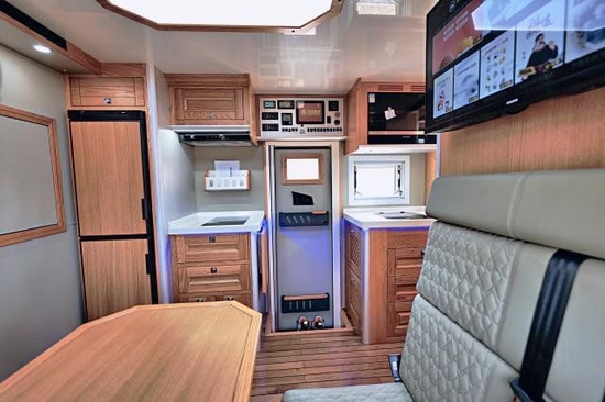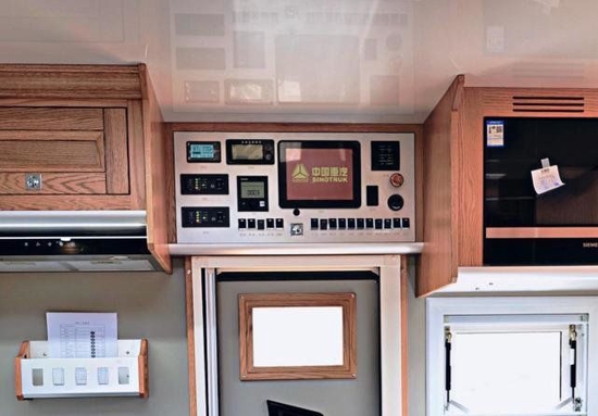 在会客区上方,安装有吸顶式储物柜加一台内嵌式行/驻车两用的三菱重工变频空调,沙发座椅后方固定有32寸飞利浦液晶电视+日本YAMAHA八喇叭音响系统,内侧墙壁配备两扇通风观景窗,在底部则安装有特鲁玛 COMBI 燃油暖风热水一体机取暖出风口和220V电源插座等设备。值得注意的是,会客区与驾驶舱中间并没有采用封闭式设计,设有一张可开启式互动窗,以便前后观察和交流使用。