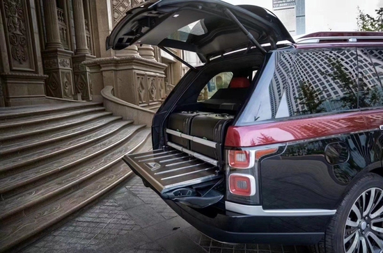 全新路虎揽胜皇家一号侧面这张气场就很明显,5980*1980*2000mm整车的数据,加长在皇家一号面前就有点小了,皇家一号依旧悬浮式的车顶两边的鲨鱼鳃也是经典设计加高的车身,让头部空间非要宽裕。