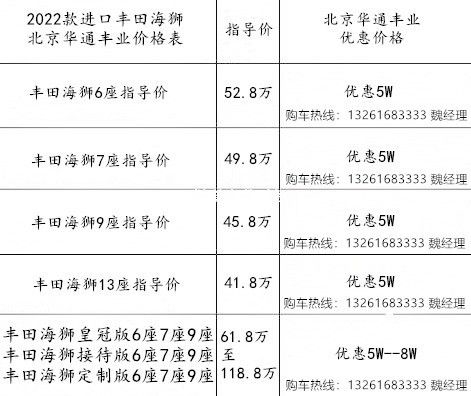 丰田海狮6座(华通丰业)丰田海狮7座(华通丰业)丰田海狮8座(华通丰业)丰田海狮9座丰田海狮10座版、丰田海狮11座版、丰田海狮12座版、丰田海狮13座版,更有可上蓝牌照的丰田海狮6座、丰田海狮7座、丰田海狮8座、丰田海狮9座,华通丰业大量现车价格优惠。13811284111 魏经理