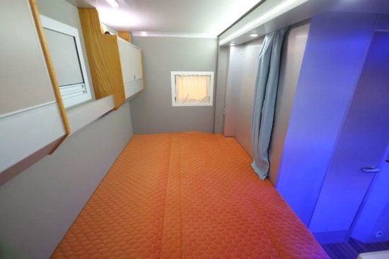 尾置横床可拓展,拓展后的空间非常充裕,可容纳多人休息,并配有豪华床垫带来舒适的睡眠体验;尾床侧方带有外推窗加强采光、通风,顶部储物柜丰富储物空间,不透光床帘有效保障内部人员隐私,私密性强。