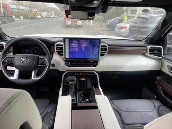 23款丰田红杉的内饰的实用性与空间利用率在这代红杉身上均得到提升,坐进车内,第一感受就是大,前排的两个大尺寸的真皮座椅,自带打孔透气皮料,四幅式多功能方向盘,握在手里的质感不错,转向也没有想象那么重,T型的中控平台,尺寸方面也比一般车型大不少,14英寸的中控触摸屏,集成了几乎所有的影音娱乐以及车身控制功能。