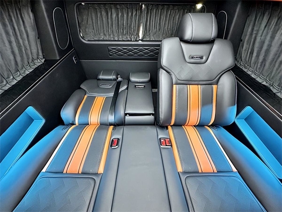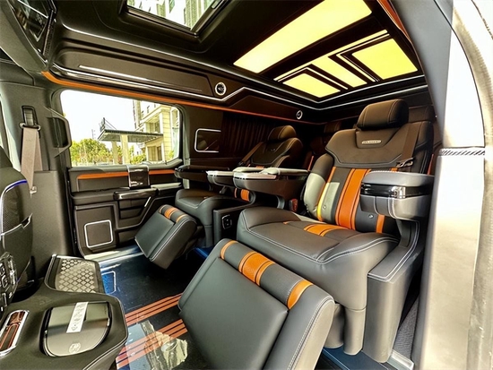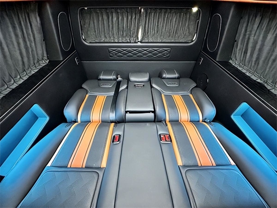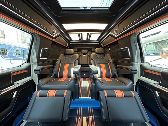 顶部半隔断的车载无线网络电视机,全车10个进口BO音响系统,再配合顶部天窗和后部的三色宫格顶灯相结合,搭配整车的线条式氛围灯,凸显整车的层次感,也烘托了整体的氛围。地板部分采用的是碳纤维风格的地板,档次十足。车内总体空间感十分宽敞,适用于商务接待或家庭旅行。